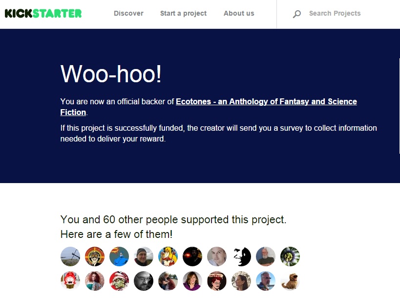 Hurry if you want to help them! I did, they’re half-way there. And you know how Kickstarter works, don’t you? If they don’t reach their stated goal (in this case £1,000) they don’t get the money, Kickstarter cancels the whole campaign and doesn’t take any money you have contributed. Here’s the message you get once you’ve paid in: